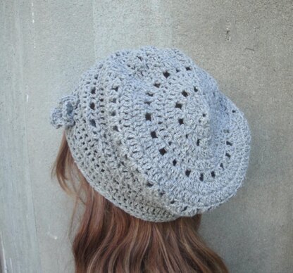 Worked from the top down, Roslyn is a chic slouch hat with a pretty lacy pattern on the back and comfortable, slouchy fit. A quick project and very versatile hat, appealing to women and teens alike. Wear it up as a loose beanie or back as a slouch…. Skip the flower for a simpler look, or attach several for extra fun! 1 skein of Cascade Roslyn will make 2 hats. Skill – easy Size: Small-Average, Average-Large 20-23”, 21-24” circumference x 10” long Yarn: 1 skein Cascade Yarns Roslyn (382y/100g; 65 wool & 35 silk) #17 Silver Hook: G/4mm & F/3.75mm, or size needed to obtain guage Gauge: 16 sts and 4 rows = 4” in double crochet on larger hook