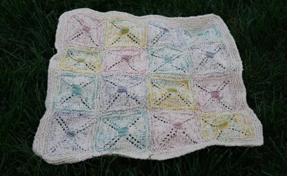 This adorable baby blanket is a perfect way to use up leftover bits of sock yarn. Each square is worked from the center out beginning with a small square worked in sock yarn. The main color is then added, and with the strands held together, squares are knit in the round from the center out.