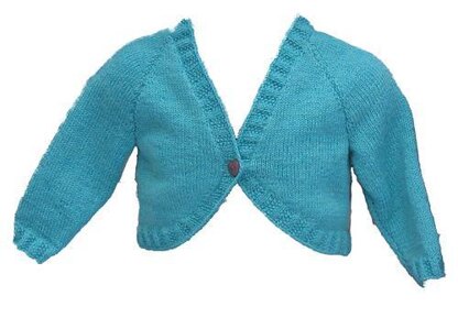 A raglan bolero with circular knitted button border. Knitted in complimentary self patterning and plain yarns with pretty moss & rib stitch borders.