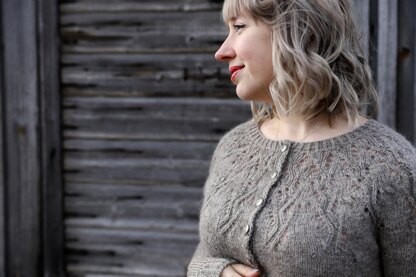 This cardigan is worked flat, top-down and, of course, seamlessly. The cardigan has a round yoke and a simple lace pattern. The rest of the cardigan is stockinette stitch. The back of the neck is shaped taller with short rows right after the yoke and there are instructions for an optional bust dart.