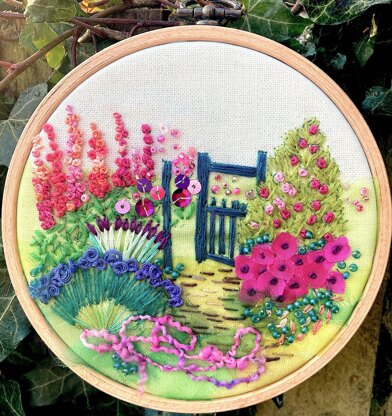 The Garden Gate leads you from one beautiful garden into a hidden garden beyond. Tall foxgloves and a lovely Camelia on either side of the gate makes one wonder what riches are on the other side? Simple stitching and lots of beads make for an easy and pleasant kit to do. The kit contains: