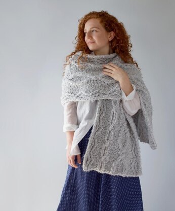 Coalescing quintessential Aran knit with lofty silk yarn, Roxane makes for an enjoyable and sumptuous knit. The cozy wrap lends a perfect canvas for the twisted zigzags and classic cables in juxtaposed scales. While Roxane is knitted in bulky weight yarn, it will look equally sophisticated as a scarf made in lighter yarn weights.
