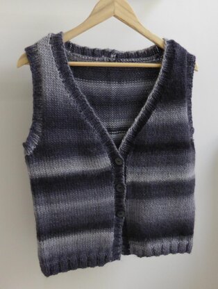 Lady’s stocking stitch vest with 2x2 rib bands, in two styles. Style A has a deep, round neck. Style B is a front opening, V neck style with three buttons.