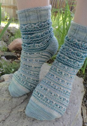 This sock pattern was designed for leftovers. Suspension bridges are formed with slipped-in-front stitches that are gathered together, and are over lacy canyons.