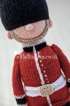 The Royal Guard looks very proud in his Uniform. The Red Jacket has a black and white collar with a white stripe down the centre and is decorated with Gold buttons. His Trousers, Boots and Bearskin are all in Black and the red stripe down the outside of his trousers completes his look.