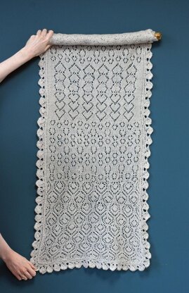 This beautiful wedding shawl contains wedding motifs, including hearts and horseshoes, and is edged using the beautiful Queen’s Edging stitch pattern. The shawl has a garter stitch background, so all wrong side rows are knitted.