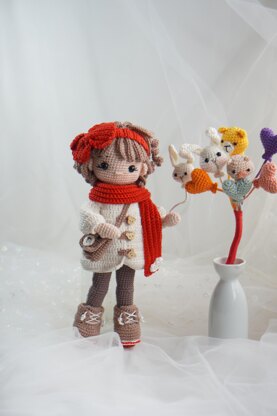 - Create your own charming crochet doll with this easy-to-follow PDF pattern! This cute little girl comes dressed for winter with a cozy coat, scarf, and boots, carrying a bouquet of mini balloon friends — including a bunny, bear, and heart-shaped balloons. Perfect for gifting, decorating, or adding to your handmade toy collection.