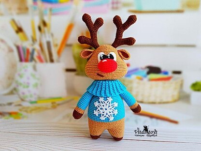 This crochet pattern contains a detailed description of how to create Christmas Deer Rudolph, with a great amount of step-by-step photos and a list of necessary materials. Materials needed to create a 12.2 in/31 cm tall toy: ● Main color yarn – beige, Beatriz acrylic (you surely will have another brand that is produced in your country), 100 g +/-350 m or 381 yds. (one skein) ● Yarn for the sweater - blue : Beatriz acrylic 100 g, +/- 350 m ● Yarn for the horns - brown : Beatriz acrylic 100 g, +/- 350 m ● Yarn for eyes - white and black: Beatriz acrylic 100 g, +/- 350 m, (a little) ● Yarn for the snowflake - white: Cotton 75 g, +/- 311 m (a little) ● Crochet hooks: 1.5mm, 2.5mm, 3.0mm (or any other in accordance with the yarn you use). ● Tapestry needle, scissors, pliers. ● Soft stuffing (like cotton wool, hollow fiber, polyfill, etc.)