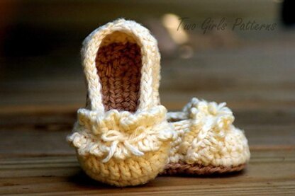 These little slippers are really fun to make and work up fast. They are made with worsted weight yarn and sport weight for the ruffles.