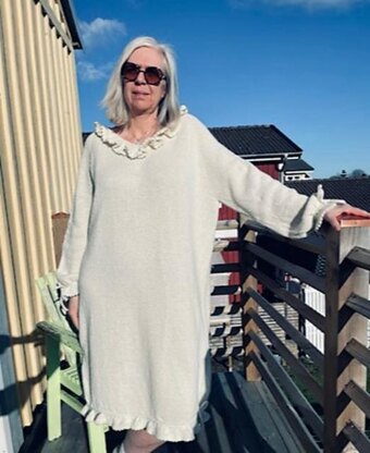 Denna klänning är stickad med 2 trådar av Supersoft. Positive ease är 10-12cm och matchar en byst vidd på 80-85cm (85.90cm) 90-95cm (95-100cm) 100-110cm (110-120cm) 120-130cm.