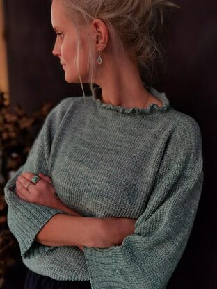 The sweater is worked top down. First a ruffled mock neck is worked in the round. Then, the back sts and a set of short rows is worked back and forth, later on joined at the front and worked back and forth to the underarm, when the body is joint in the round and worked to the end.