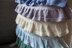 The Ruffled Pillow is worked in the round with yarn held double in stockinette stitch, with purl stitches at each side to create a “seam”. Each color ruffle is knit separately before they are sewn to the pillow base.