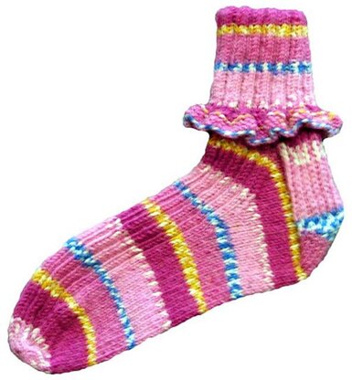 This sock is feminine with the cute ruffle on the cuff and the ribbing along the instep makes it fit beautifully. Included in the pattern is a chart for how long the foot should be knitted for different sized shoes. Very handy!