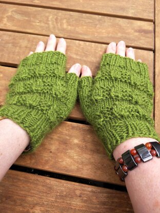 Beautifully warm fingerless mitts with a cute almond pattern all the way around. The thumb gusset is worked in stocking/stockinette stitch.