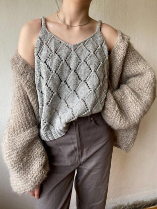 The Ruke diamond top is a semi-wool knit that is worked bottom to top using a Diamond stitch pattern. It has slits at the hem in both directions with the back hem a little bit longer than the front. It finishes with a shaped V-neck and slim shoulder straps at the front and back.