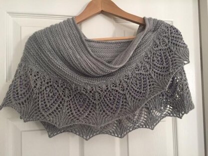 The shawl is made with heavy fingering weight yarn or sport weight yarn. Any brand will work for this pattern. This shawl was made with Hanrmaiden's Casbh, using two circular needles.