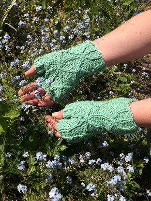 Fun fingerless mitts for spring or autumn with cables inspired by runner bean poles.