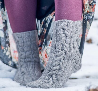These cozy socks with simple cable details are just the thing to wrap your feet in while sitting in front of the fireplace.