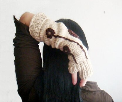Natural looking and warm, these hand knitted fingerless gloves will keep your hands warm and your fingers free. Perfect to make an unique gift. The crocheted flowers are sewn onto gloves. The file includes step by step instructions and photos. Difficulty: Easy.link text