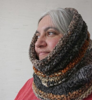 This versatile, unisex hooded cowl works up quickly in a super bulky, self-striping yarn that does the colorwork for you. The simple, textured stitch pattern is perfect for beginners, or for more advanced knitters looking for a project to work on while distracted. The pattern includes instructions for working seamlessly in the round or knitting flat and then seaming.