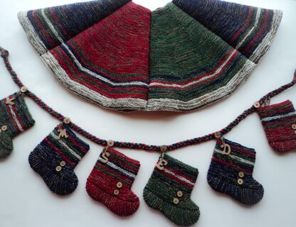 Rustic Xmas Stocking Garland & Matching Tree Skirt knitting pattern * Includes instructions to create 6 stockings 6”x 6” that are knitted in the round as one piece. One braided garland created with 3 i-cords with buttons attached to hang stocking and matching xmas tree skirt that is knitting in 6 sections knitted flat and then hand sewn together to create 15” long tree skirt that measures 18” at top by 102” at the bottom circumference or 34” diameter.