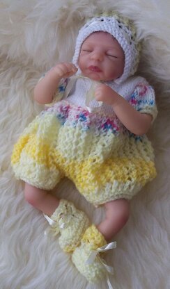 Worked in finer 4ply yarn and smaller needles the completed set is suitable for dolls 8-10".