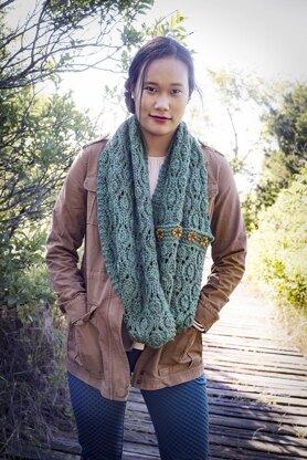 Ruth’s cowl is worked in a pretty lace pattern with a motif that reminds me of Grandma Ruth’s favorite flower, the rose. Buttons and buttonholes at opposite ends join the cowl, allowing the piece to be worn as either cowl or scarf.