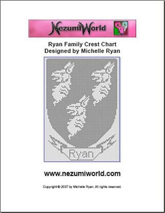 Ryan Family Crest Chart (with first row is written for both a 1 x 1 & 1 x 2 filet crochet grid). Additional information sizes using different yarns is also included. i.e. Using Crochet Cotton Thread size 10: approx. width = 17.3 inches, height = 25.8 inches, Using Worsted Weight Yarn: approx. width = 67.5 inches, height = 94.8 inches. Uses American crochet terms. This makes a beautiful wall hanging, curtain or throw. (depending on yarn/ thread used) for your home. The chart will also work for other crafts - cross stitch, knitting, beading.