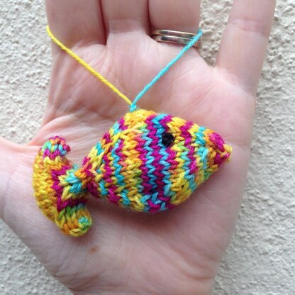 Got a little bit of leftover yarn? We all do! Why not turn it into a cheery wee fishie to decorate your Christmas tree, a wrapped present, or a cabinet knob? Knit in the round from the tail to the nose with NO SEAMING, this fish can be knit in just about any yarn scraps of any weight that you have lying around. Just 20 yards will do the trick.