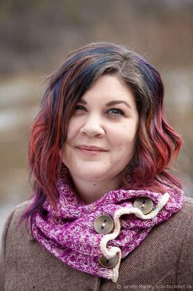 This cowl was designed for my local yarn shop's (Shall We Knit?) retreat in November 2017, using the featured yarn that attendees received in their goodie bag. Another local designer (Lynne Sosnowski) and I were challenged to each design new pattern using the same yarn. I created this buttoned cowl and Lynne designed Benmiller Rendezvous Mitts.