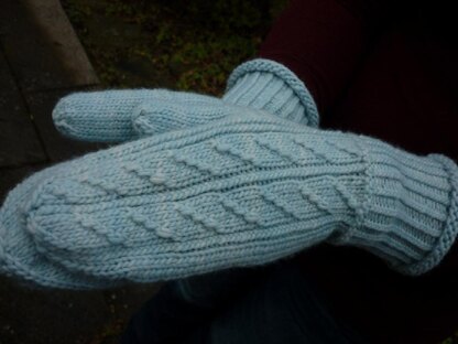 A pair of mittens made to match the Sade hat. Includes rolled cuffs, twisted stitches (including twisted decreases) and a thumb gusset.