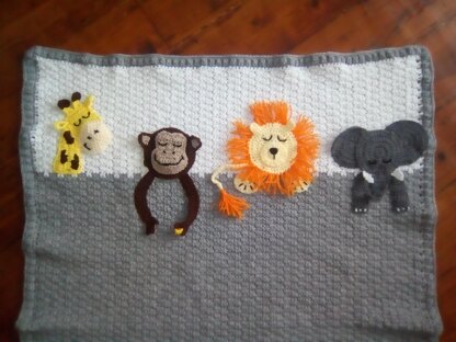 An applique blanket perfect for that animal or safari themed nursery. The blanket measures approximately 86cm x 106cm. It is adorned with 4 different applique animals - giraffe, lion, monkey and elephant. Each of the animals has an element of interaction as parts are left loose to play with.