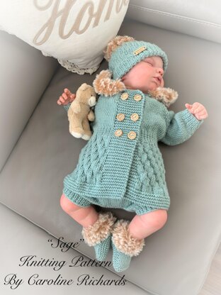 A cosy 4 piece set, perfect for winter. With the option to make a 3/4 length jacket or longer coat with fur hood. The double-breasted Jacket/Coat is knitted flat from the top down on straight needles, so requires minimal sewing. You also have the option to make shorts or longer trousers which are knitted in a similar way so minimal sewing is required and fewer seams, making the outfit comfier for the baby. The booties and bobble hat complete the outfit and knit up quickly