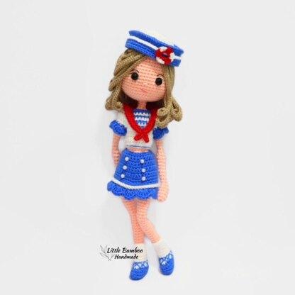 Written in English using US terminology. Materials: • 4 Ply Fingering Acrylic / Milk Cotton Yarn - Light peach - White - Khaki brown - Red - Blue • Fiberfill or cotton • Crochet hook size 2 mm • Wire • Black eye 9 mm • Button 8 mm ( 3 ) • White bead 5 mm ( 6 ) Size: about 32 cm Skill level: INTERMEDIATE