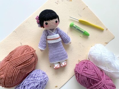 The Sakura Kimono Doll is a lovely girl wearing a traditional Japanese dress. Her outfit includes a kimono with an obi sash and sandals. She also wears “sakura” cherry blossom flowers in her hair, which is styled in a bun. Crochet her as the perfect handmade gift! The Sakura Kimono Doll’s PDF pattern file includes complete written instructions for the doll-making process, photo references for the crocheted parts, four video tutorials for parts of the pattern, and step-by-step explanations for finishing details.