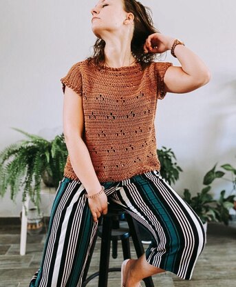 *Sakura summer tee is an easy beginner friendly crochet pattern. Slightly loose fit and airy open feel tee. features the eyelet stitch and a little bubble texture at the bottom edge, armholes and neckline.
