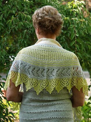 This light and frothy crescent shawl in two sizes (petite/tall) begins at the lower edge with a frill of lace and progresses through a series of patterns that alternate between openwork and solid garter stitch to the upper edge. The easy to work patterns make for quick knitting as does the “pi” construction, with cleverly placed decrease rows that reduce the stitch count all at once. Shown in a two-color arrangement, the knitter could easily add a third shade or work it in a single color—the design lends itself nicely to gradient colorways as well.