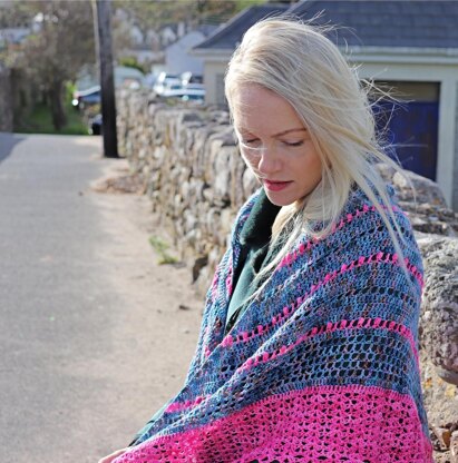 2 skeins of your favourite fingering weight yarn in two contrast colours, is all that is needed to show off this light and lacy triangle shawl. A wide wingspan to curl around your neck and shoulders. An easy make using dc, puff stitches and shells that will keep your interest as you crochet.