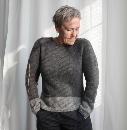 Sammelsurium is a twist on the original Simple Ziggurat Sweater. Knitted in lofty, warm, and soft Gotland DK this pullover quickly became a favourite to wear at home, going out, everywhere. With its contrasting lined hem, lined collar and cuffs, Sammelsurium has a higher neckline and finer finishing details than other Simple Ziggurats. In addition, a travelling cable snakes its way down one sleeve. For a plainer look you can omit the travelling cable. Or knit it with a more subtly different yarn. Oh, and I added a small coin pocket – there is always room for a pocket.