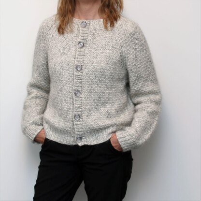 The Sand cardigan is a classical raglan model featuring a simple structural pattern which is fun and easy to knit. The texture of the knit, combined with the colors and characteristics of the two yarns held together; one thread of tweed silk mohair (Gepard Kid Seta Tweed) and one thread of a chunky blown yarn (Gepard PuF), is reminiscing of the sand-borne glaciers of Iceland and results in a truly luxurious garment.