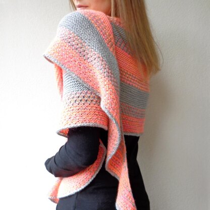 The shawl knits up quickly and the alternating colour-bands/sections keep your interest while being easy and fun to knit. It is worked top-down in one piece from the centre out as a crescent shaped shawl with a curved top edge.