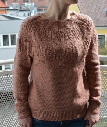 It is a seamless top-down sweater with a lace pattern on the yoke while the rest is made in simple stockinette.