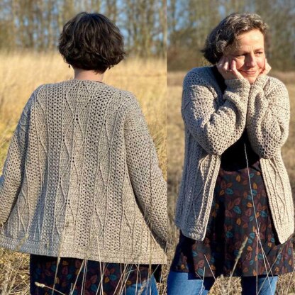 Sandglass Cardigan is a crochet cardigan with an intricate cable stitch pattern on the back and both front sections.