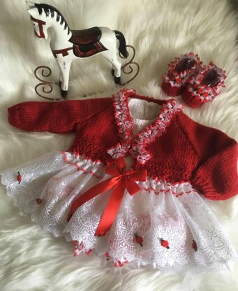 How beautiful is this set!! A team collaberation to pull this together but credit has to go to Allison with adding embellishments to make it come alive!! A true princess design, “Santa Baby” is a must have for your baby girl! AND because it is knitted, it will keep her cosy too!! Pattern contains instructions for Dress, Bolero and Slippers in sizes 16″, 18″ and 20″. Packs of embellishments and lace to complete the outfit are available from Allison on our Facebook Page.