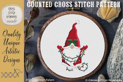 An Adorable Christmas Gnome holding a string of lights counted cross stitch design!\nCross Stitch Pattern designed by Marcia Manning.\nDesign is 74 stitches wide by 125 stitches high.\nPDF is a COLOR counted cross stitch chart which lists suggested DMC floss colors, and includes a color picture.\n\nStitched design size is as follows:\nSize 11 count: 6.73 x 11.36 inches or 17.09 x 28.86 cm\nSize 14 count: 5.29 x 8.93 inches or 13.43 x 22.68 cm\nSize 16 count: 4.63 x 7.81 inches or 11.75 x 19.84 cm\nSize 18 count: 4.11 x 6.94 inches or 10.44 x 17.64 cm\nSize 22 count: 3.36 x 5.68 inches or 8.54 x 14.43 cm