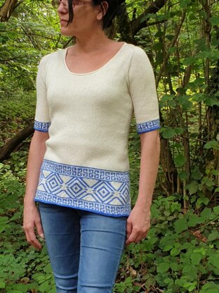 The sweater is knitted top down using the contiguous method of shaping set-in sleeves developed by Suzie M. The top of the sweater is in stockinette stitch and the lower body contains a stranded pattern. The sleeves (short or long) are knitted in the round, in stockinette stitch with stranded pattern at the end.