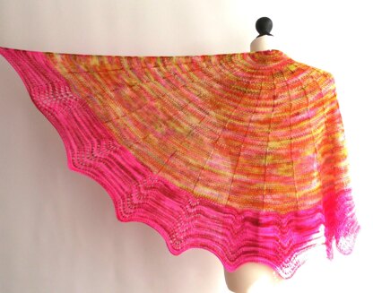 This top down half circle shawl has panels of reverse stocking stitch seperated by lines of slipped stitches. A bright pink wavy border stands out from the crowd.