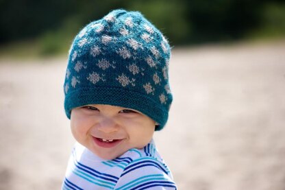 This beanie-style hat was inspired by the sardine exhibit at the Monterey Bay Aquarium. There, you stand under a round dome aquarium, where the school of sardines swim endlessly in circles.