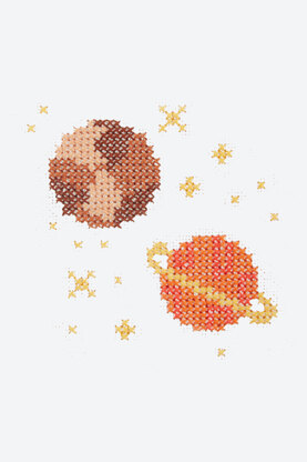 Take a trip to the outer reaches of the galaxy with this Saturn and Jupiter free cross stitch pattern. Add this colorful and stylised design to small linens, clothing, or just as a decorative cross stitch wall hanging for yourself or as a gift. For beginner cross stitchers, check out our guide on how to cross stitch!