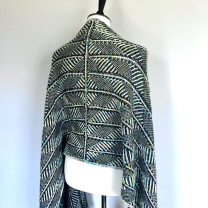 The Saturn Rain Wrap is a gorgeous seamless rectangular wrap that is completely reversible. Alternating rows of two-color brioche and two-color garter stitch form the pattern of concentric diamonds. Lines worked parallel to the edges of the wrap add interest to the stitch pattern and give it an architectural flair. The wrap is worked first in the round, then divided and worked flat in parts.